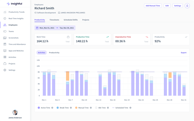 Insightful helps you understand how your team works in real-time, including the apps and websites they use, screenshots, idle and offline time, and more. Plus, customizable privacy settings ensure employee privacy is always protected.