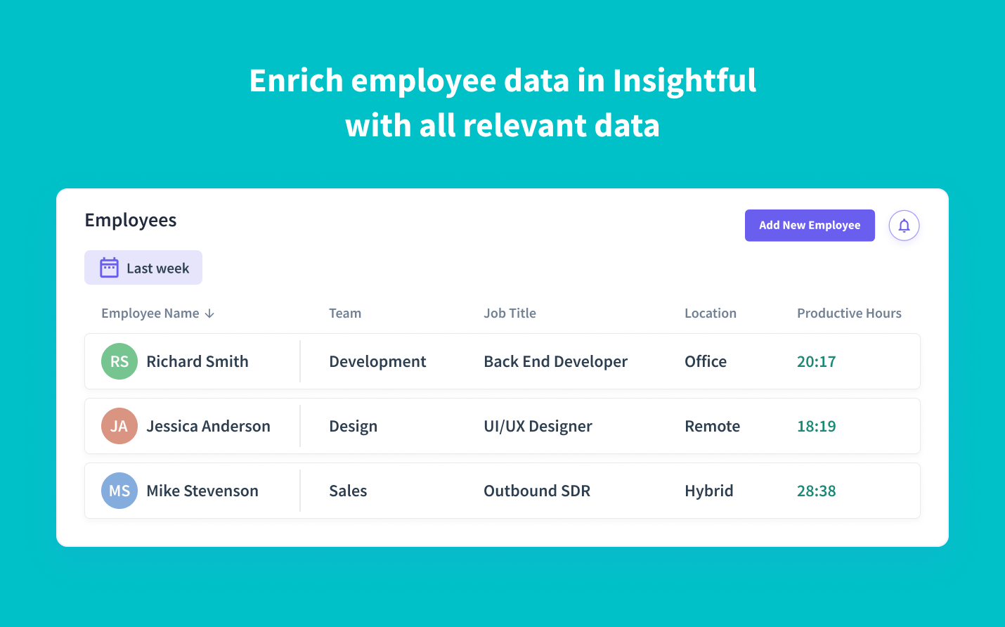 Automatically sync your employee HR data into Insightful, complete with HR field enrichment and team assignment.
